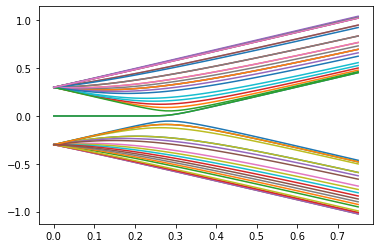 return syst, left_leadThe KWANT give us a chance to plot an energy spectrum of such a model.
