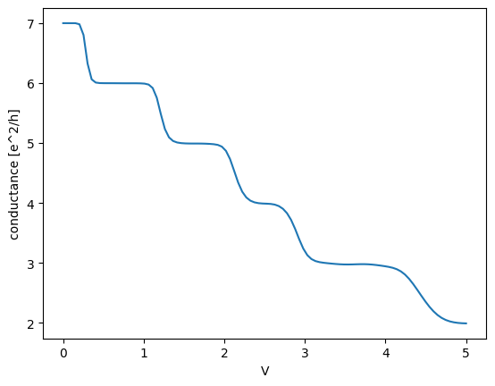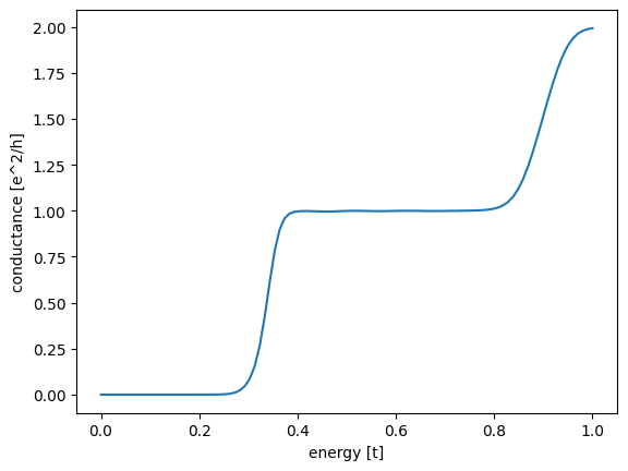plt.show()Now we make a system with default parameters. As expected we see conductance quantisation steps with electron energy. We have to remember we oberate in energy regime, where we have bands present.
