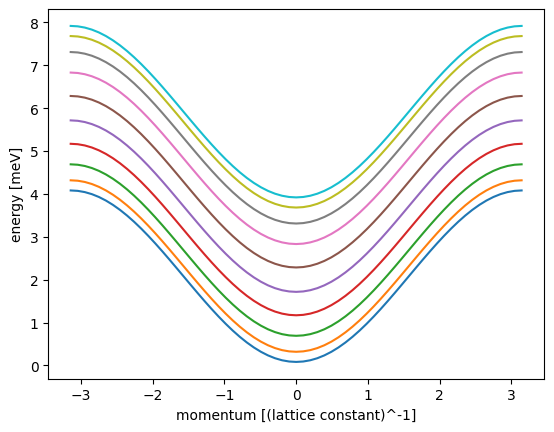 plt.xlabel("momentum [(lattice constant)^-1]")