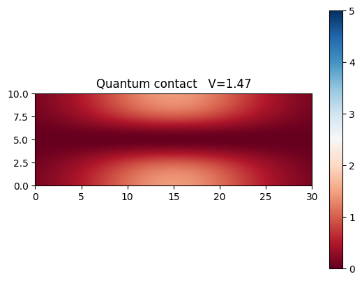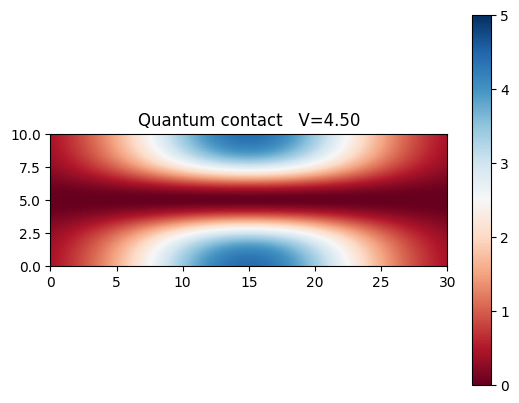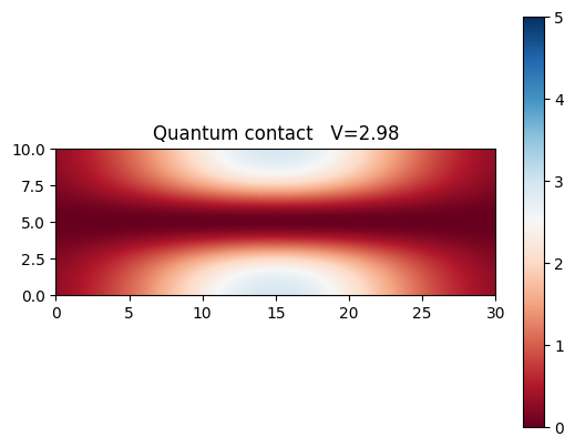 import matplotlib.pyplot as pltA Quantum Point Contact (QPC) is a nanostructured device that allows the controlled flow of electrons through a narrow constriction or channel in a quantum system. It is a fundamental building block in the field of mesoscopic physics and has been extensively studied both theoretically and experimentally.