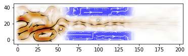 kwant.plotter.current(sys, c, show=False, ax=ax)Now let’s define the potential V function as \[ V(x,y) = V_0 e^{-\left(\frac{x-L}{\sigma_x}\right)^{10}}\cdot \left(1-e^{-\left(\frac{y-W}{\sigma_y}\right)^{10}}\right) \]